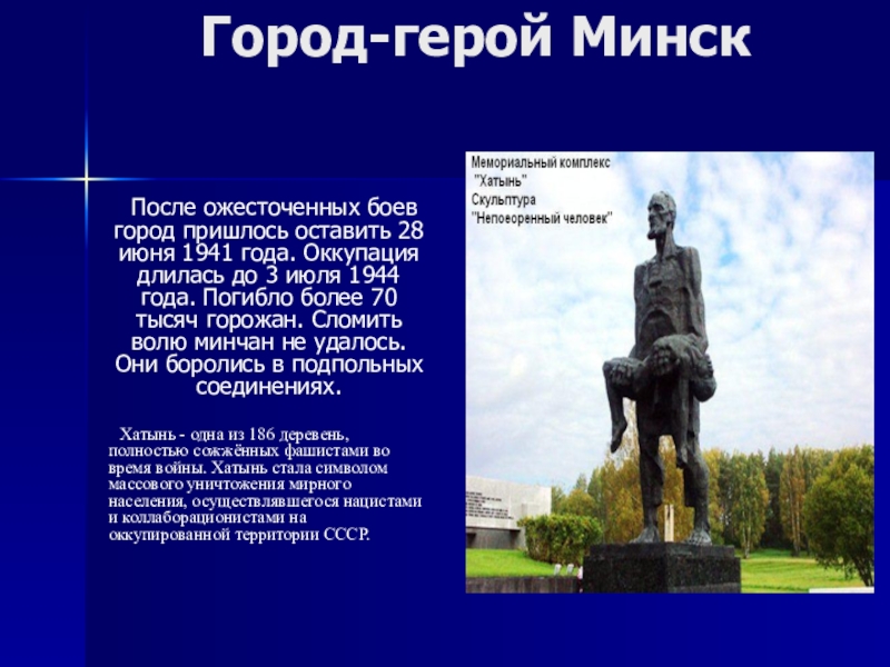Хатынь - одна из 186 деревень, полностью сожжённых фашистами во время войны. Хатынь стала символом массового уничтожения мирного населения, осуществлявшегося нацистами и коллаборационистами на оккупированной территории СССР.
