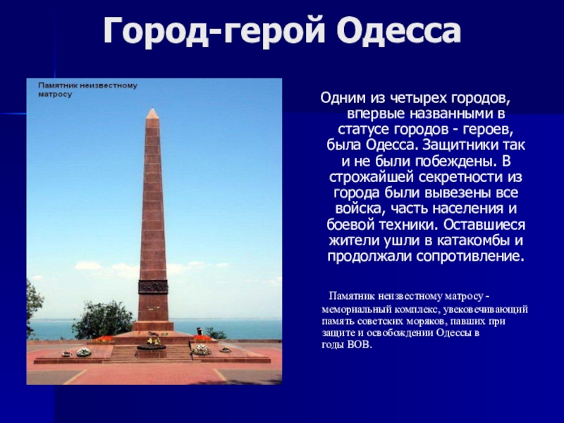 Памятник неизвестному матросу - мемориальный комплекс, увековечивающий память советских моряков, павших при защите и освобождении Одессы в годы ВОВ.