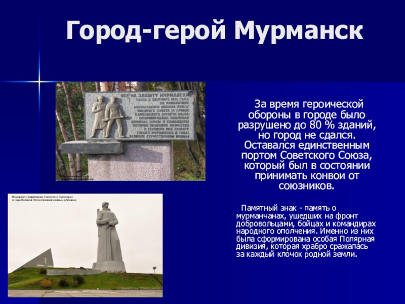 Памятный знак - память о мурманчанах, ушедших на фронт добровольцами, бойцах и командирах народного ополчения. Именно из них была сформирована особая Полярная дивизия, которая храбро сражалась за каждый клочок родной земли.