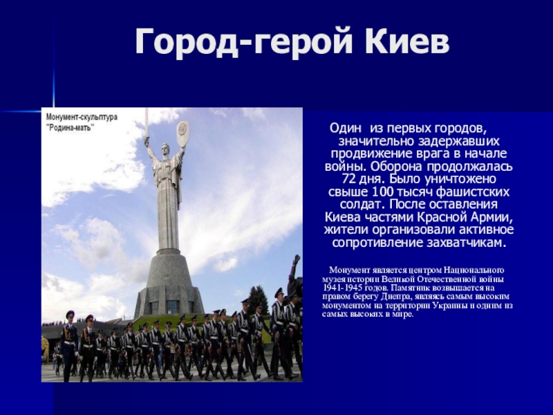 войны. Оборона продолжалась 72 дня. Было уничтожено свыше 100 тысяч фашистских солдат. После оставления Киева частями Красной Армии, жители организовали активное сопротивление захватчикам.