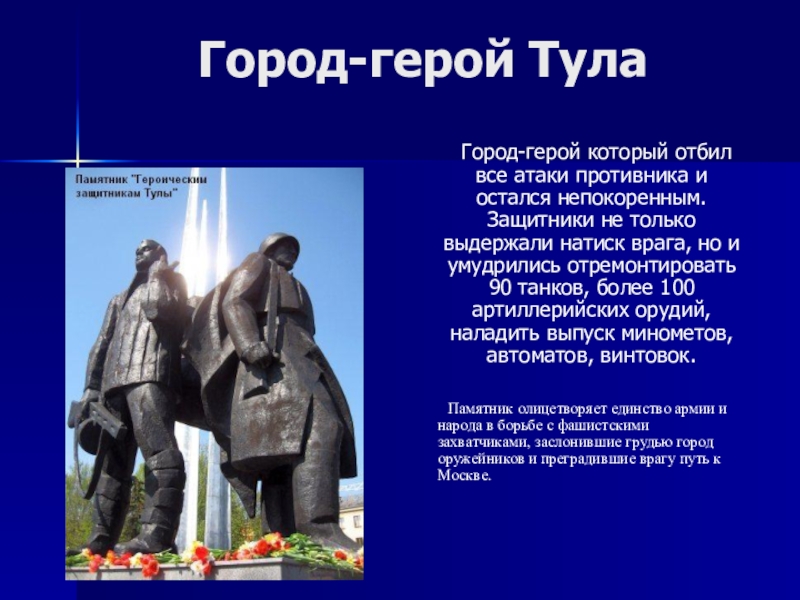 Памятник олицетворяет единство армии и народа в борьбе с фашистскими захватчиками, заслонившие грудью город оружейников и преградившие врагу путь к Москве.