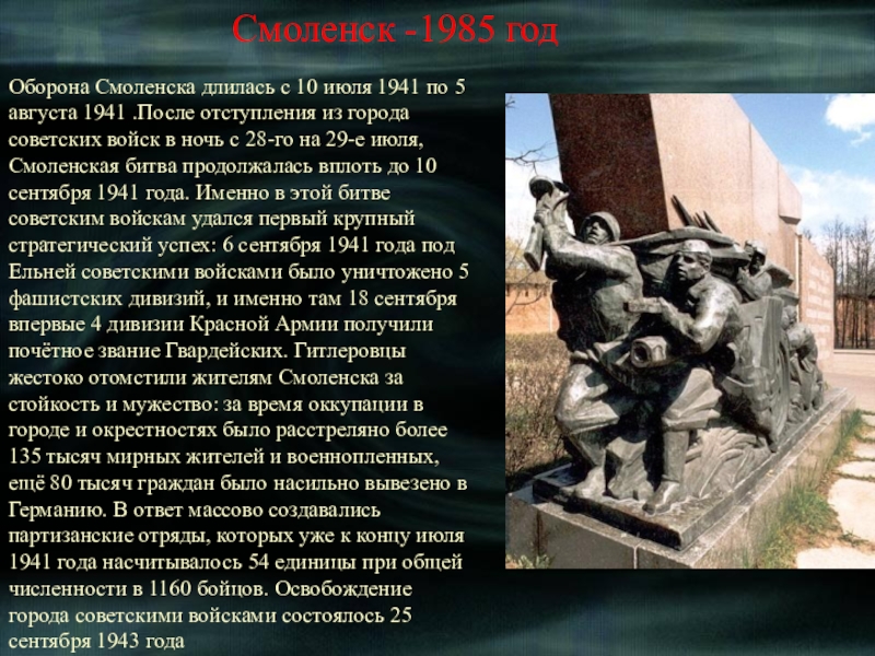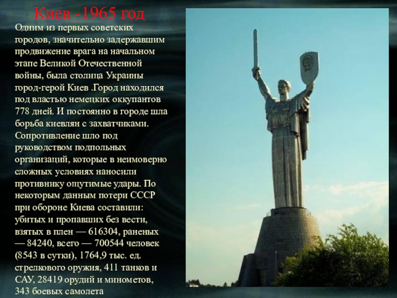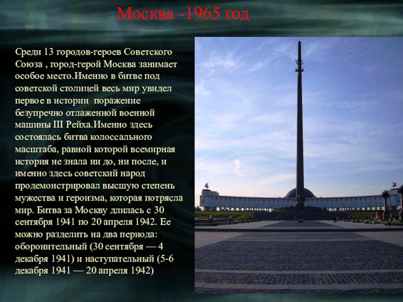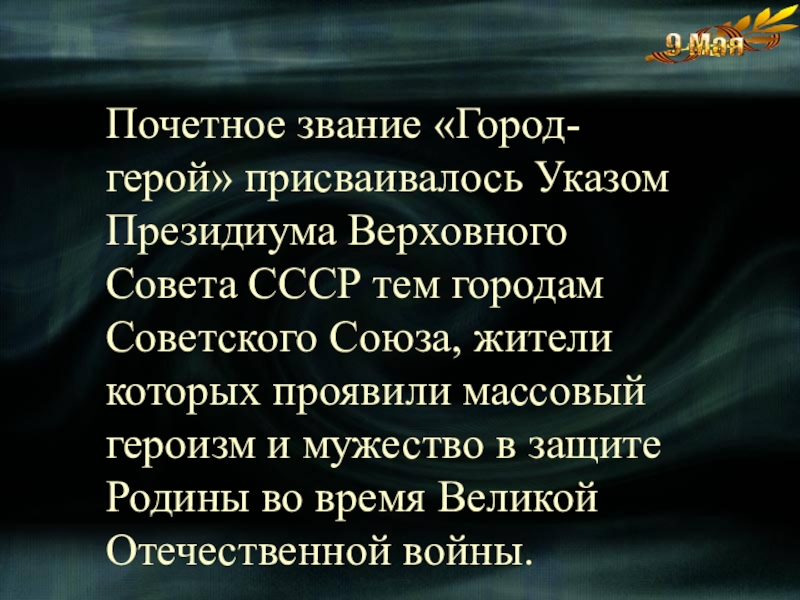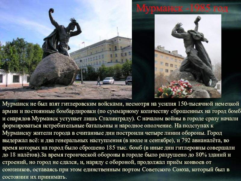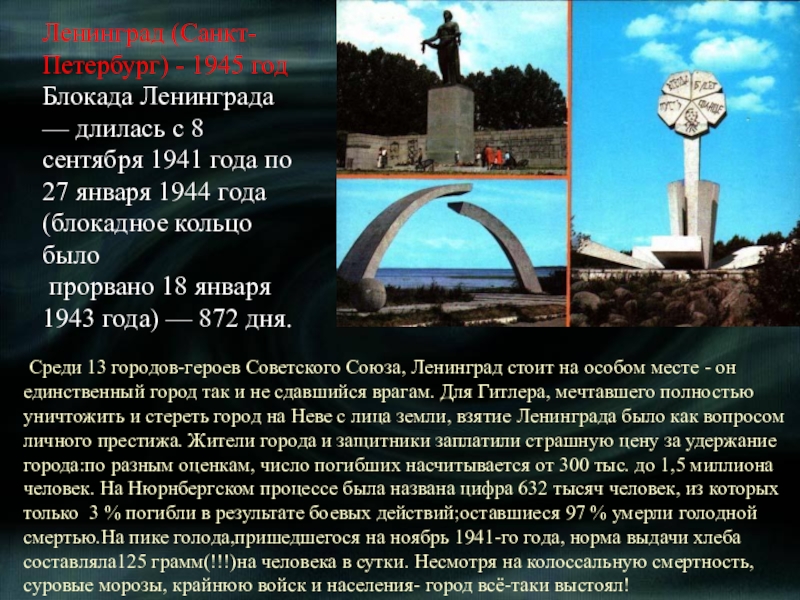 Среди 13 городов-героев Советского Союза, Ленинград стоит на особом месте - он единственный город так и не сдавшийся врагам. Для Гитлера, мечтавшего полностью уничтожить и стереть город на Неве с лица земли, взятие Ленинграда было как вопросом личного престижа. Жители города и защитники заплатили страшную цену за удержание города:по разным оценкам, число погибших насчитывается от 300 тыс. до 1,5 миллиона человек. На Нюрнбергском процессе была названа цифра 632 тысяч человек, из которых только 3 % погибли в результате боевых действий;оставшиеся 97 % умерли голодной смертью.На пике голода,пришедшегося на ноябрь 1941-го года, норма выдачи хлеба составляла125 грамм(!!!)на человека в сутки. Несмотря на колоссальную смертность, суровые морозы, крайнюю войск и населения- город всё-таки выстоял!