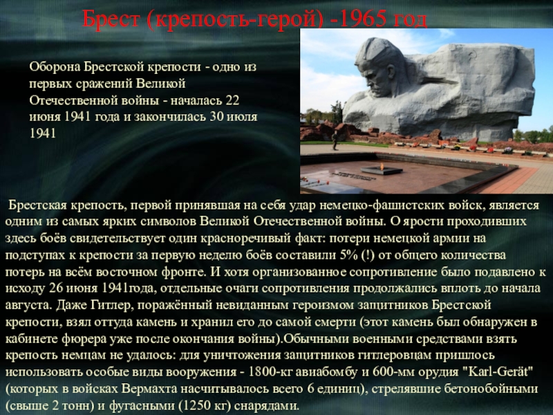 Брестская крепость, первой принявшая на себя удар немецко-фашистских войск, является одним из самых ярких символов Великой Отечественной войны. О ярости проходивших здесь боёв свидетельствует один красноречивый факт: потери немецкой армии на подступах к крепости за первую неделю боёв составили 5% (!) от общего количества потерь на всём восточном фронте. И хотя организованное сопротивление было подавлено к исходу 26 июня 1941года, отдельные очаги сопротивления продолжались вплоть до начала августа. Даже Гитлер, поражённый невиданным героизмом защитников Брестской крепости, взял оттуда камень и хранил его до самой смерти (этот камень был обнаружен в кабинете фюрера уже после окончания войны).Обычными военными средствами взять крепость немцам не удалось: для уничтожения защитников гитлеровцам пришлось использовать особые виды вооружения - 1800-кг авиабомбу и 600-мм орудия "Karl-Gerät" (которых в войсках Вермахта насчитывалось всего 6 единиц), стрелявшие бетонобойными (свыше 2 тонн) и фугасными (1250 кг) снарядами.