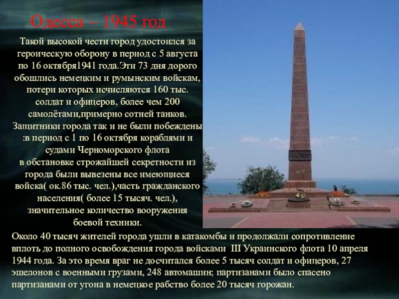 Около 40 тысяч жителей города ушли в катакомбы и продолжали сопротивление вплоть до полного освобождения города войсками III Украинского флота 10 апреля 1944 года. За это время враг не досчитался более 5 тысяч солдат и офицеров, 27 эшелонов с военными грузами, 248 автомашин; партизанами было спасено партизанами от угона в немецкое рабство более 20 тысяч горожан.