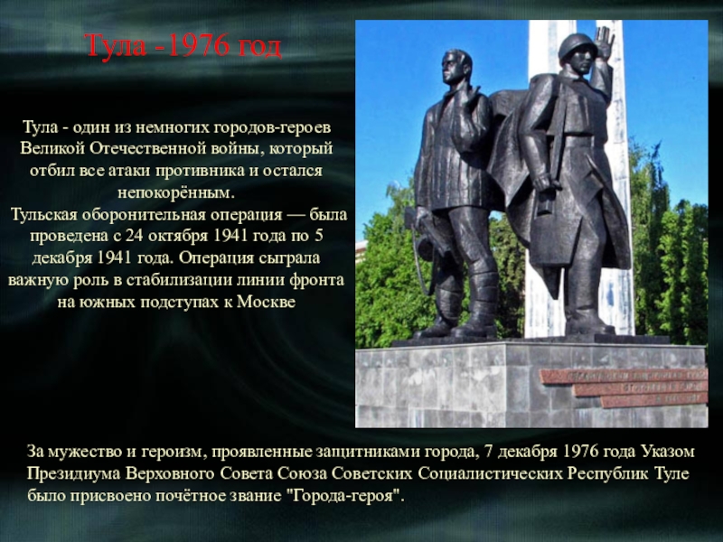 За мужество и героизм, проявленные защитниками города, 7 декабря 1976 года Указом Президиума Верховного Совета Союза Советских Социалистических Республик Туле было присвоено почётное звание "Города-героя".