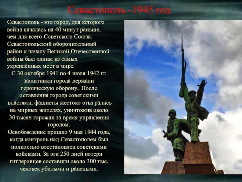 Севастополь - это город, для которого война началась на 40 минут раньше, чем для всего Советского Союза. Севастопольский оборонительный район к началу Великой Отечественной войны был одним из самых укреплённых мест в мире.