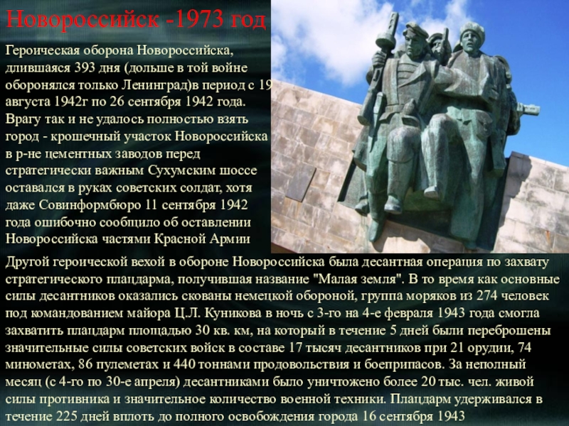 Другой героической вехой в обороне Новороссийска была десантная операция по захвату стратегического плацдарма, получившая название "Малая земля". В то время как основные силы десантников оказались скованы немецкой обороной, группа моряков из 274 человек под командованием майора Ц.Л. Куникова в ночь с 3-го на 4-е февраля 1943 года смогла захватить плацдарм площадью 30 кв. км, на который в течение 5 дней были переброшены значительные силы советских войск в составе 17 тысяч десантников при 21 орудии, 74 минометах, 86 пулеметах и 440 тоннами продовольствия и боеприпасов. За неполный месяц (с 4-го по 30-е апреля) десантниками было уничтожено более 20 тыс. чел. живой силы противника и значительное количество военной техники. Плацдарм удерживался в течение 225 дней вплоть до полного освобождения города 16 сентября 1943