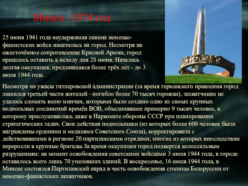 Несмотря на ужасы гитлеровской администрации (за время германского правления город лишился третьей части жителей - погибло более 70 тысяч горожан), захватчикам не удалось сломить волю минчан, которыми было создано одно из самых крупных подпольных соединений времён ВОВ, объединявшее примерно 9 тысяч человек, к которому прислушивались даже в Наркомате обороны СССР при планировании стратегических задач. Свои действия подпольщики (из которых более 600 человек были награждены орденами и медалями Советского Союза), корректировали с действовавшими в регионе 20 партизанскими отрядами, многие из которых впоследствии переросли в крупные бригады.За время оккупации город подвергся колоссальным разрушениям: на момент освобождения советскими войсками 3 июля 1944 года, в городе оставалось всего лишь 70 уцелевших зданий. В воскресенье, 16 июля 1944 года, в Минске состоялся Партизанский парад в честь освобождения столицы Белоруссии от немецко-фашистских захватчиков.