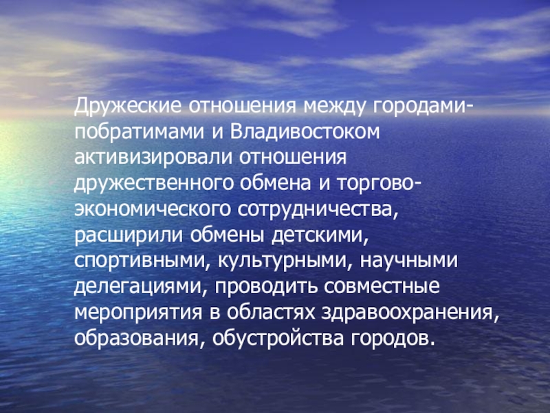 Слайд 17Дружеские отношения между городами-побратимами и Владивостоком активизировали отношения дружественного обмена и