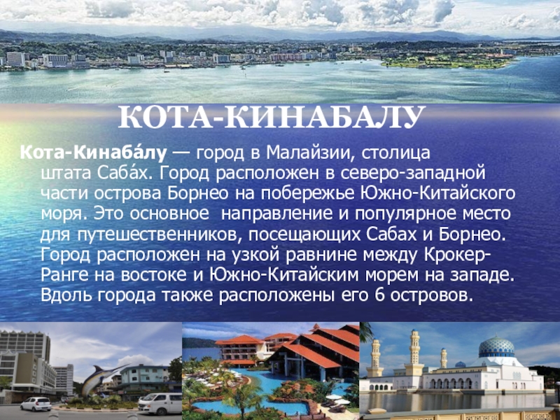 Кота-Кинаба́лу — город в Малайзии, столица штата Саба́х. Город расположен в северо-западной части острова Борнео на