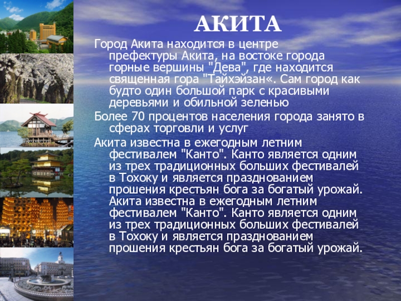 Акита известна в ежегодным летним фестивалем "Канто". Канто является одним из трех традиционных больших фестивалей в Тохоку и является празднованием прошения крестьян бога за богатый урожай. Акита известна в ежегодным летним фестивалем "Канто". Канто является одним из трех традиционных больших фестивалей в Тохоку и является празднованием прошения крестьян бога за богатый урожай.