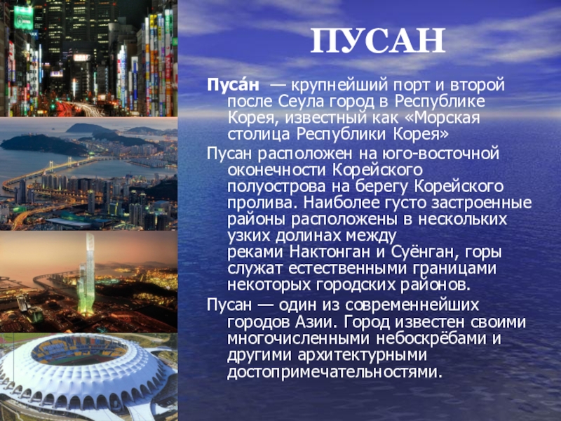 Пуса́н — крупнейший порт и второй после Сеула город в Республике Корея, известный как «Морская