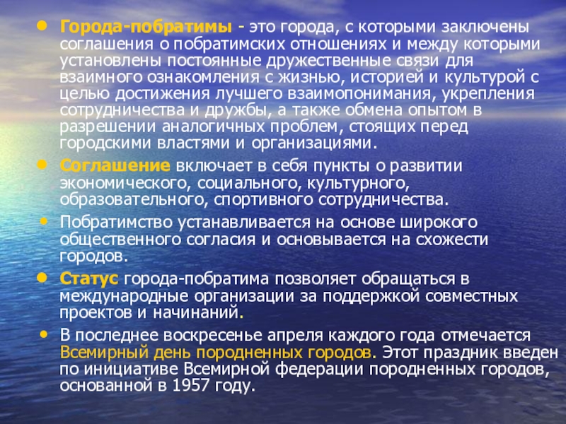 Слайд 2Города-побратимы - это города, с которыми заключены соглашения о побратимских отношениях и