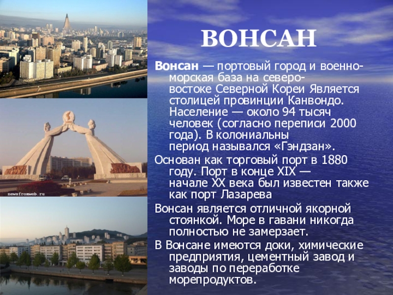 Вонсан — портовый город и военно-морская база на северо-востоке Северной Кореи Является столицей