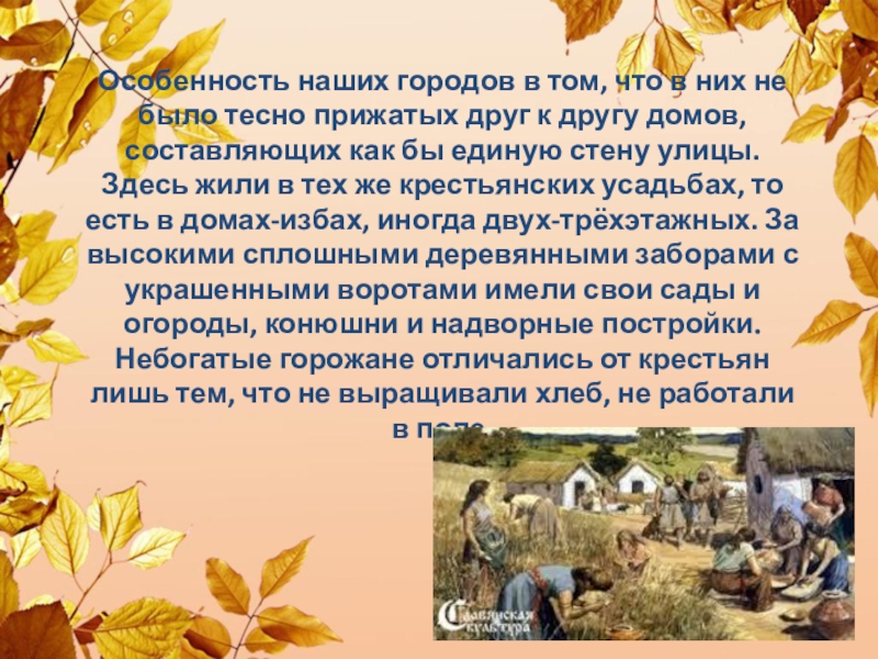 прижатых друг к другу домов, составляющих как бы единую стену улицы. Здесь жили в тех же крестьянских усадьбах, то есть в домах-избах, иногда двух-трёхэтажных. За высокими сплошными деревянными заборами с украшенными воротами имели свои сады и огороды, конюшни и надворные постройки. Небогатые горожане отличались от крестьян лишь тем, что не выращивали хлеб, не работали в поле.