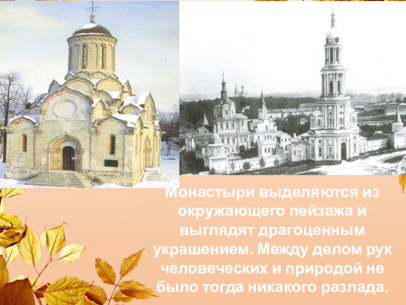 Слайд 14Монастыри выделяются из окружающего пейзажа и выглядят драгоценным украшением. Между делом