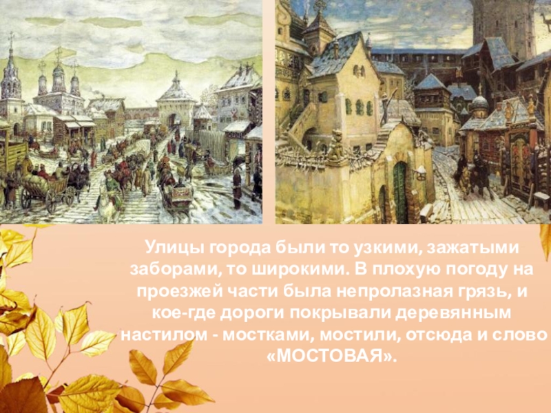 Слайд 12 Улицы города были то узкими, зажатыми заборами, то широкими. В плохую