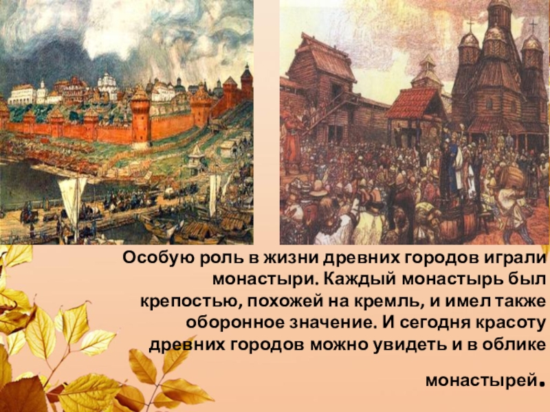Особую роль в жизни древних городов играли монастыри. Каждый монастырь был крепостью, похожей на кремль, и имел