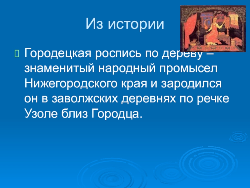 Из истории Городецкая роспись по дереву –знаменитый народный промысел Нижегородского края и зародился он в заволжских деревнях по речке Узоле близ Городца.