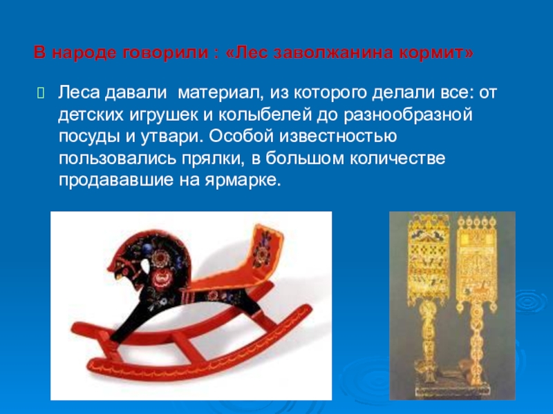 В народе говорили : «Лес заволжанина кормит»Леса давали материал, из которого делали все: от детских игрушек и