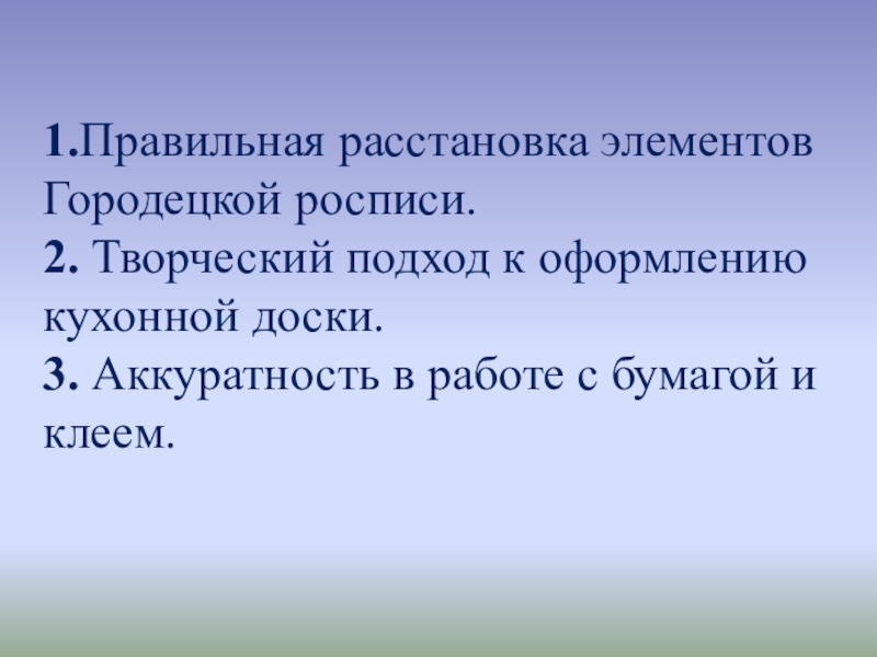 1.Правильная расстановка элементов Городецкой росписи.2. Творческий подход к оформлению кухонной доски.3. Аккуратность в работе с бумагой и