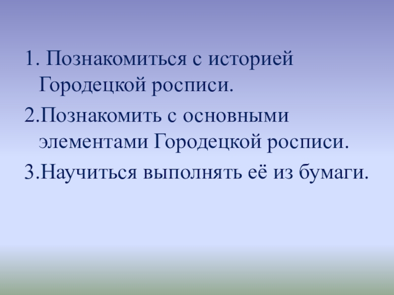 Слайд 41. Познакомиться с историей Городецкой росписи.