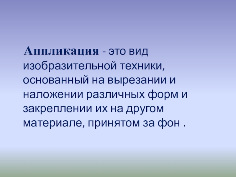 Аппликация - это вид изобразительной техники, основанный на вырезании и наложении различных форм и закреплении