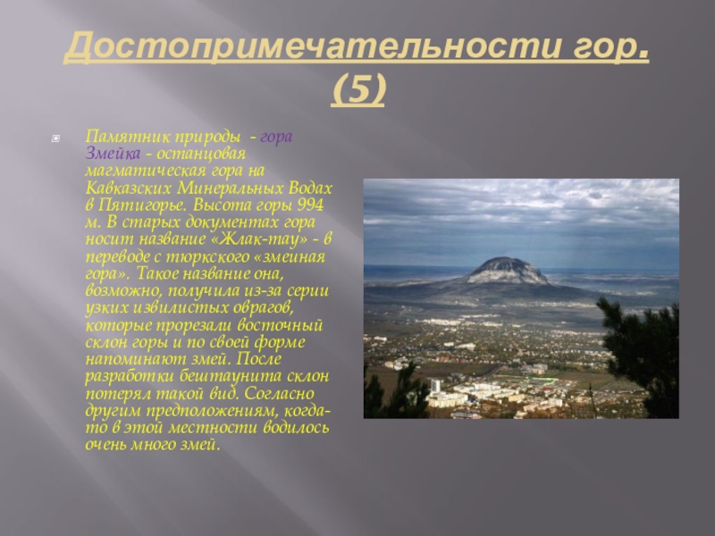 на Кавказских Минеральных Водах в Пятигорье. Высота горы 994 м. В старых документах гора носит название «Жлак-тау» - в переводе с тюркского «змеиная гора». Такое название она, возможно, получила из-за серии узких извилистых оврагов, которые прорезали восточный склон горы и по своей форме напоминают змей. После разработки бештаунита склон потерял такой вид. Согласно другим предположениям, когда-то в этой местности водилось очень много змей.