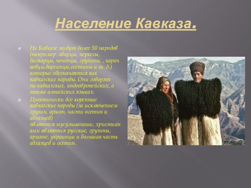кавказские народы. Они говорят на кавказских, индоевропейских, а также алтайских языках.