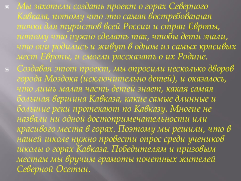 Создавая этот проект, мы опросили несколько дворов города Моздока (исключительно детей), и оказалось, что лишь малая часть детей знает, какая самая большая вершина Кавказа, какие самые длинные и большие реки протекают по Кавказу. Многие не назвали ни одной достопримечательности или красивого места в горах. Поэтому мы решили, что в нашей школе нужно провести опрос среди учеников школы о горах Кавказа. Победителям и призовым местам мы вручим грамоты почетных жителей Северной Осетии.