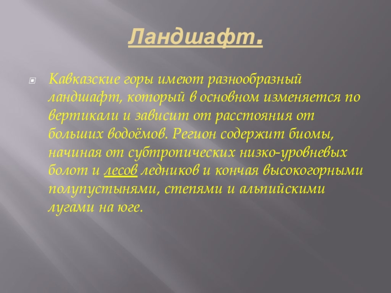 Кавказские горы имеют разнообразный ландшафт, который в основном изменяется по вертикали