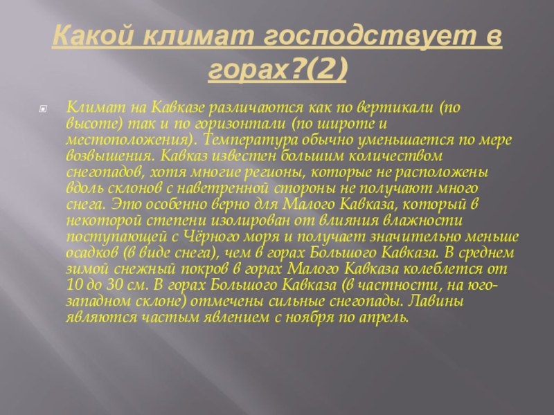 (по высоте) так и по горизонтали (по широте и местоположения). Температура обычно уменьшается по мере возвышения. Кавказ известен большим количеством снегопадов, хотя многие регионы, которые не расположены вдоль склонов с наветренной стороны не получают много снега. Это особенно верно для Малого Кавказа, который в некоторой степени изолирован от влияния влажности поступающей с Чёрного моря и получает значительно меньше осадков (в виде снега), чем в горах Большого Кавказа. В среднем зимой снежный покров в горах Малого Кавказа колеблется от 10 до 30 см. В горах Большого Кавказа (в частности, на юго-западном склоне) отмечены сильные снегопады. Лавины являются частым явлением с ноября по апрель.