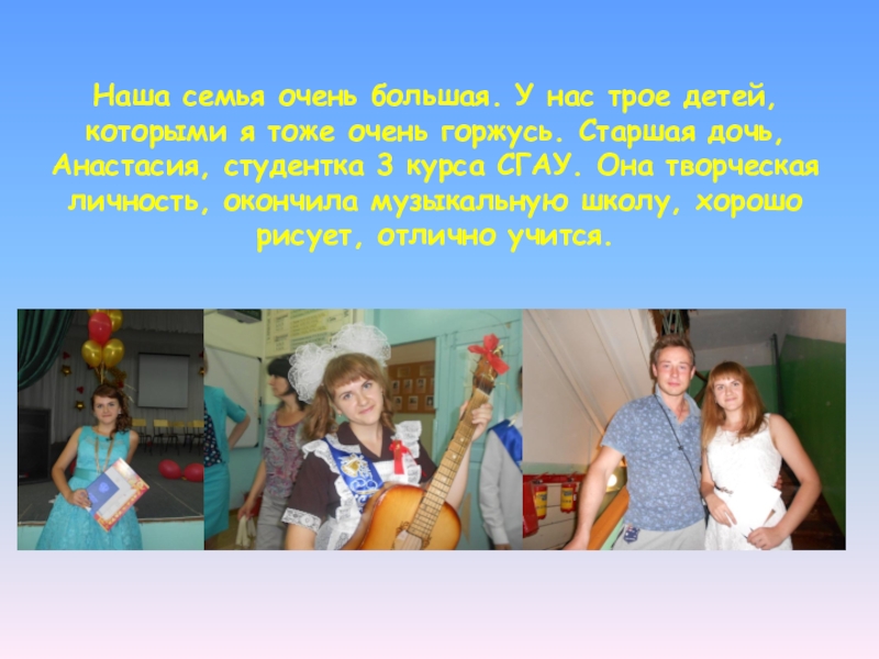очень горжусь. Старшая дочь, Анастасия, студентка 3 курса СГАУ. Она творческая личность, окончила музыкальную школу, хорошо рисует, отлично учится.