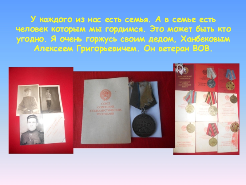 которым мы гордимся. Это может быть кто угодно. Я очень горжусь своим дедом, Ханбековым Алексеем Григорьевичем. Он ветеран ВОВ.
