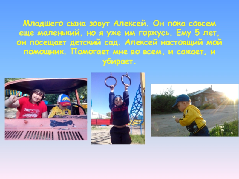 Слайд 7Младшего сына зовут Алексей. Он пока совсем еще маленький, но я