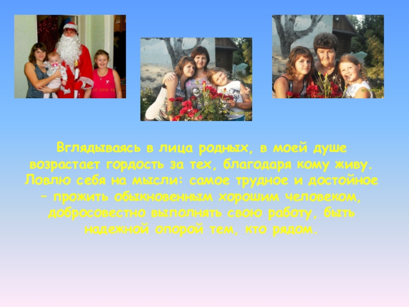 Слайд 10Вглядываясь в лица родных, в моей душе возрастает гордость за тех,