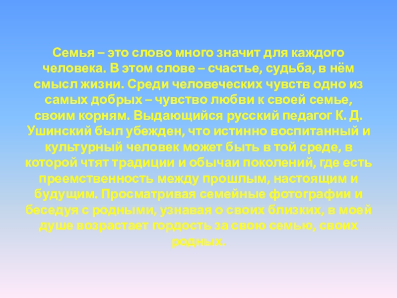 слове – счастье, судьба, в нём смысл жизни. Среди человеческих чувств одно из самых добрых – чувство любви к своей семье, своим корням. Выдающийся русский педагог К. Д. Ушинский был убежден, что истинно воспитанный и культурный человек может быть в той среде, в которой чтят традиции и обычаи поколений, где есть преемственность между прошлым, настоящим и будущим. Просматривая семейные фотографии и беседуя с родными, узнавая о своих близких, в моей душе возрастает гордость за свою семью, своих родных.