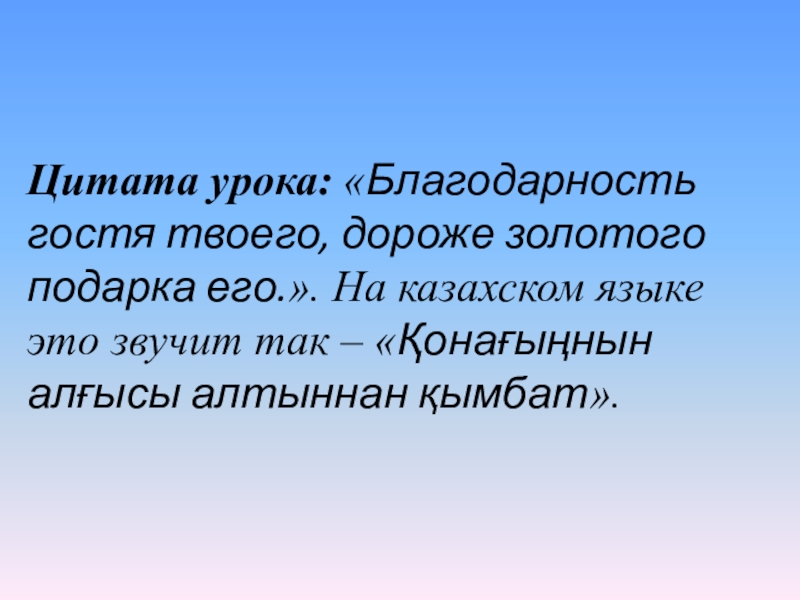 Слайд 4Цитата урока: «Благодарность гостя твоего, дороже золотого подарка его.». На казахском