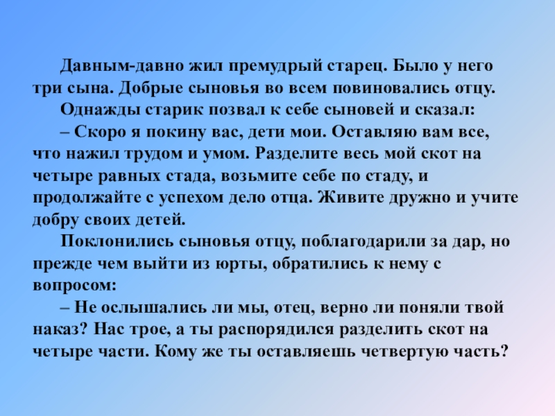 во всем повиновались отцу. Однажды старик позвал к себе сыновей и сказал: – Скоро я покину вас, дети мои. Оставляю вам все, что нажил трудом и умом. Разделите весь мой скот на четыре равных стада, возьмите себе по стаду, и продолжайте с успехом дело отца. Живите дружно и учите добру своих детей. Поклонились сыновья отцу, поблагодарили за дар, но прежде чем выйти из юрты, обратились к нему с вопросом: – Не ослышались ли мы, отец, верно ли поняли твой наказ? Нас трое, а ты распорядился разделить скот на четыре части. Кому же ты оставляешь четвертую часть?