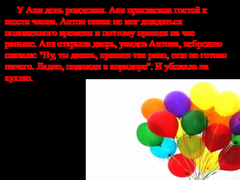 Слайд 7 У Ани день рождения. Аня пригласила гостей к шести часам. Антон