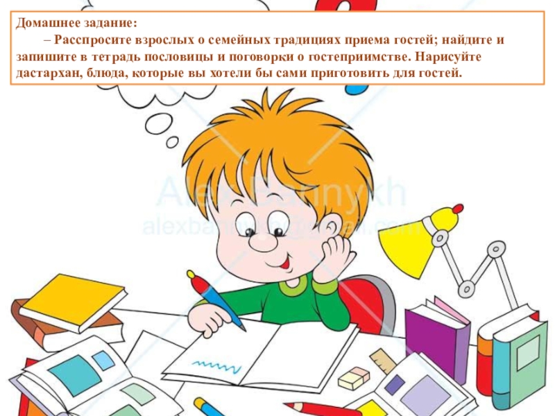 Домашнее задание:	– Расспросите взрослых о семейных традициях приема гостей; найдите и запишите в тетрадь пословицы и поговорки