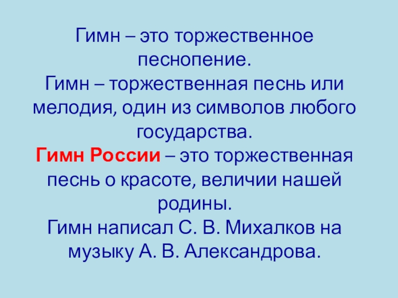 из символов любого государства. Гимн России – это торжественная песнь о красоте, величии нашей родины. Гимн написал С. В. Михалков на музыку А. В. Александрова.