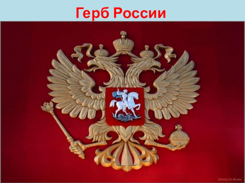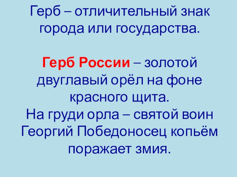 Герб – отличительный знак города или государства.  Герб России – золотой двуглавый орёл на фоне красного