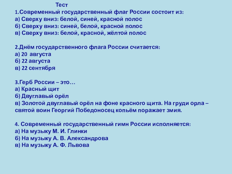 Тест 1.Современный государственный флаг России состоит из: а) Сверху вниз: белой, синей, красной полос б) Сверху вниз: синей, белой, красной полос в) Сверху вниз: белой, красной, жёлтой полос 2.Днём государственного флага России считается: а) 20 августа б) 22 августа в) 22 сентября 3.Герб России – это… а) Красный щит б) Двуглавый орёл в) Золотой двуглавый орёл на фоне красного щита. На груди орла – святой воин Георгий Победоносец копьём поражает змия. 4. Современный государственный гимн России исполняется: а) На музыку М. И. Глинки б) На музыку А. В. Александрова в) На музыку А. Ф. Львова