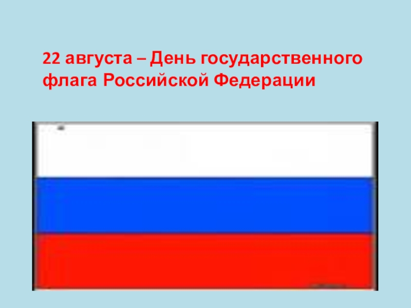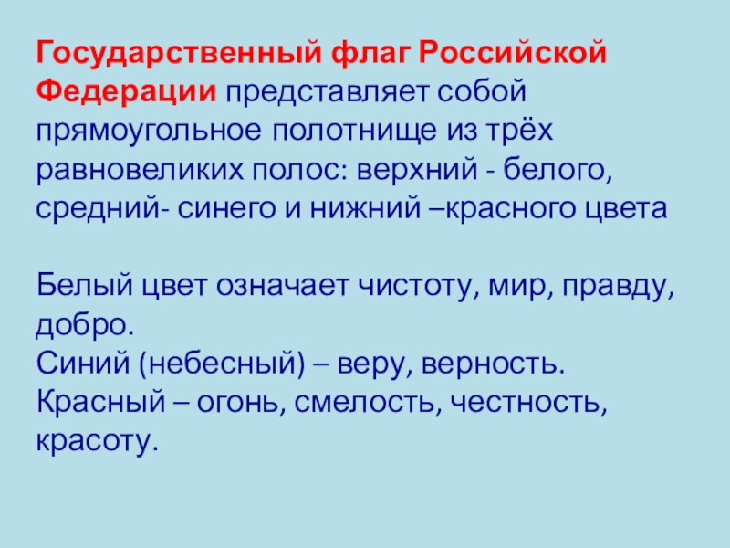 Государственный флаг Российской Федерации представляет собой прямоугольное полотнище из трёх равновеликих полос: верхний - белого, средний- синего