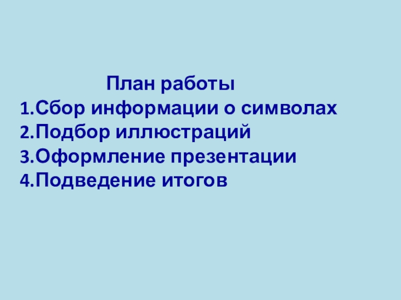 План работы 1.Сбор информации о символах 2.Подбор иллюстраций 3.Оформление презентации 4.Подведение итогов