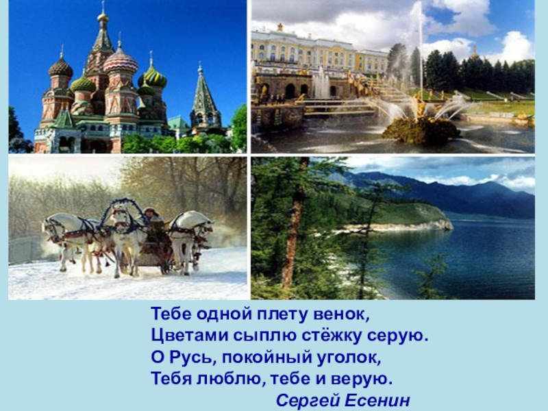 Тебе одной плету венок,Цветами сыплю стёжку серую.О Русь, покойный уголок,Тебя люблю, тебе и верую.