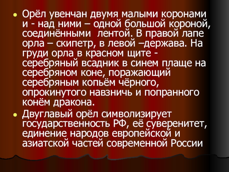Две головы орла символизируют единство страны.