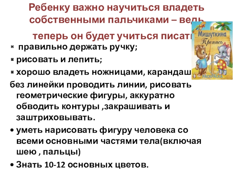 Слайд 13Ребенку важно научиться владеть собственными пальчиками – ведь теперь он будет