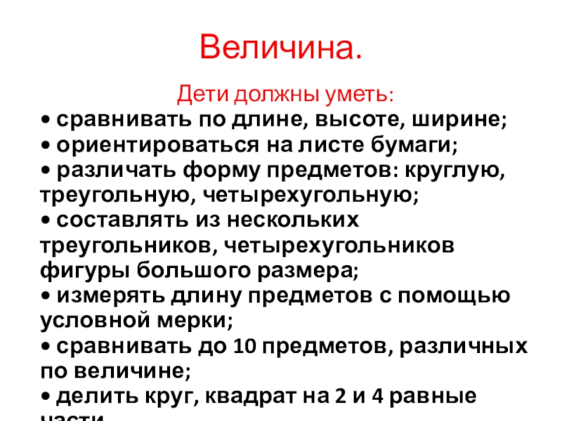 • сравнивать до 10 предметов, различных по величине;